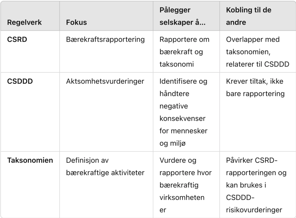 Det er lett å få seg vill i begreper og fororninger, derfor er en oppklaring på sin plass: CSRD handler om rapportering, CSDDD om ansvar og tiltak, mens taksonomien definerer hva som er bærekraftig.CSRD og taksonomien er tett koblet, mens CSDDD stiller krav til at selskaper faktisk handler i tråd med bærekraftsmålene.
