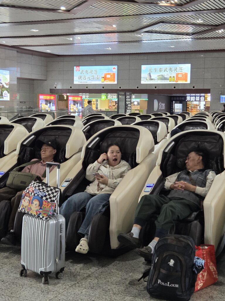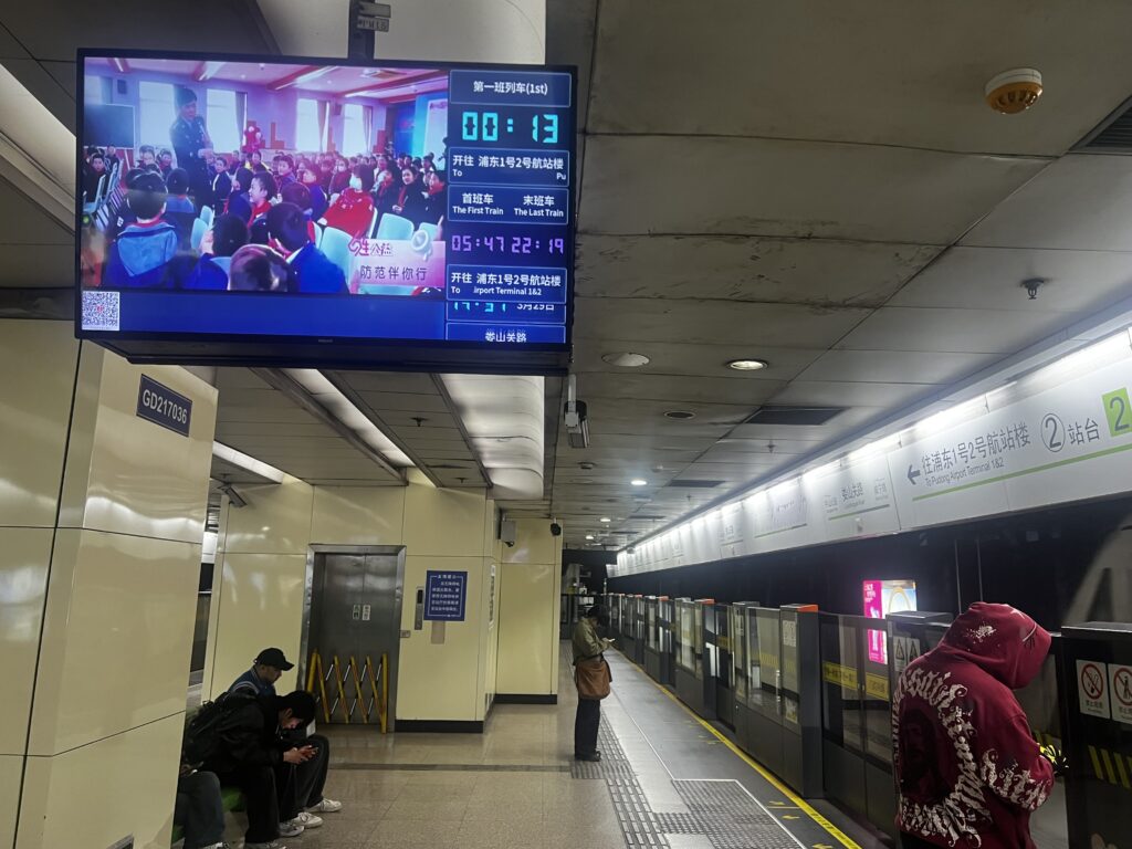 Til tross for at Kina er et av verdens mest teknologiske land, så tviholder de på å bli definert som et utviklingsland. Det er det gode grunner til, sett fra Kinas side. I hvor mange andre land kan ventende togpassasjerer slappe av i massasjestoler på stasjonen? Og på T-banen telles klokken ned sekund for sekund til T-banen skal komme. På bildet under er det 13 sekunder til T-banen kommer, og da kommer den om 13 sekunder. Verken før eller siden. Det er ikke akkurat dette vi forbinder med utviklingsland, eller med Norge for den saks skyld.