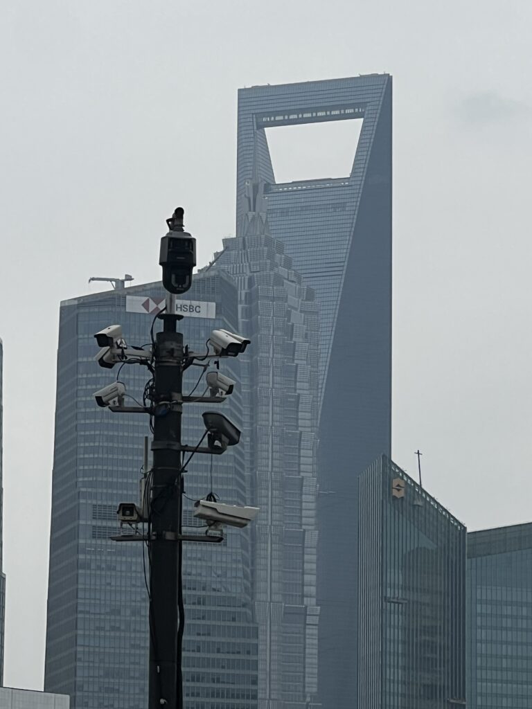 På bildet fra The Bund, skylinen i Shanghai, ser du 10 kameraer. Det øverste er et 360 grader kamera. Slike kameramaster finner du mange av i Kina.
