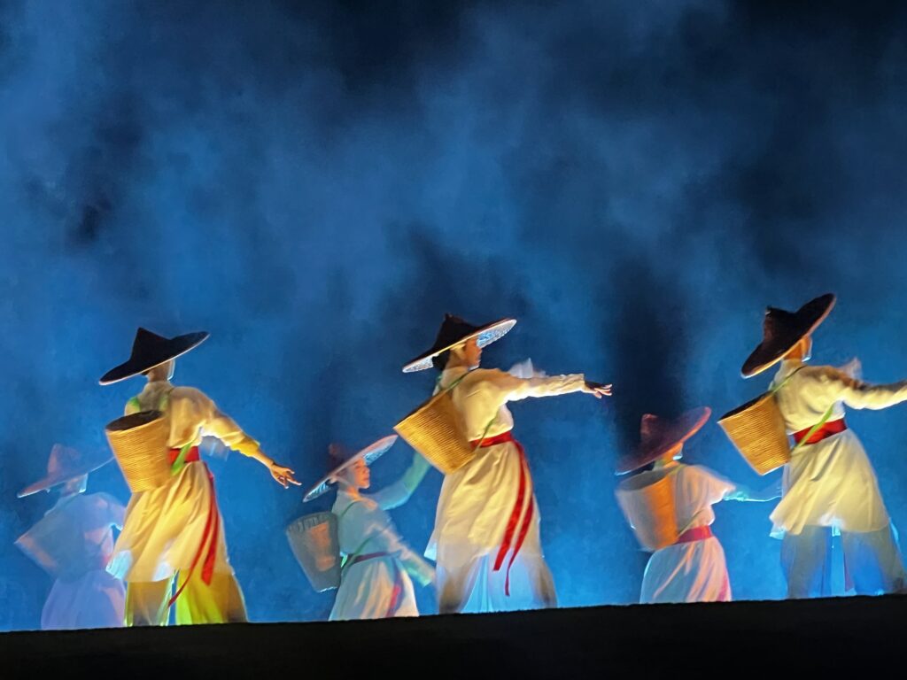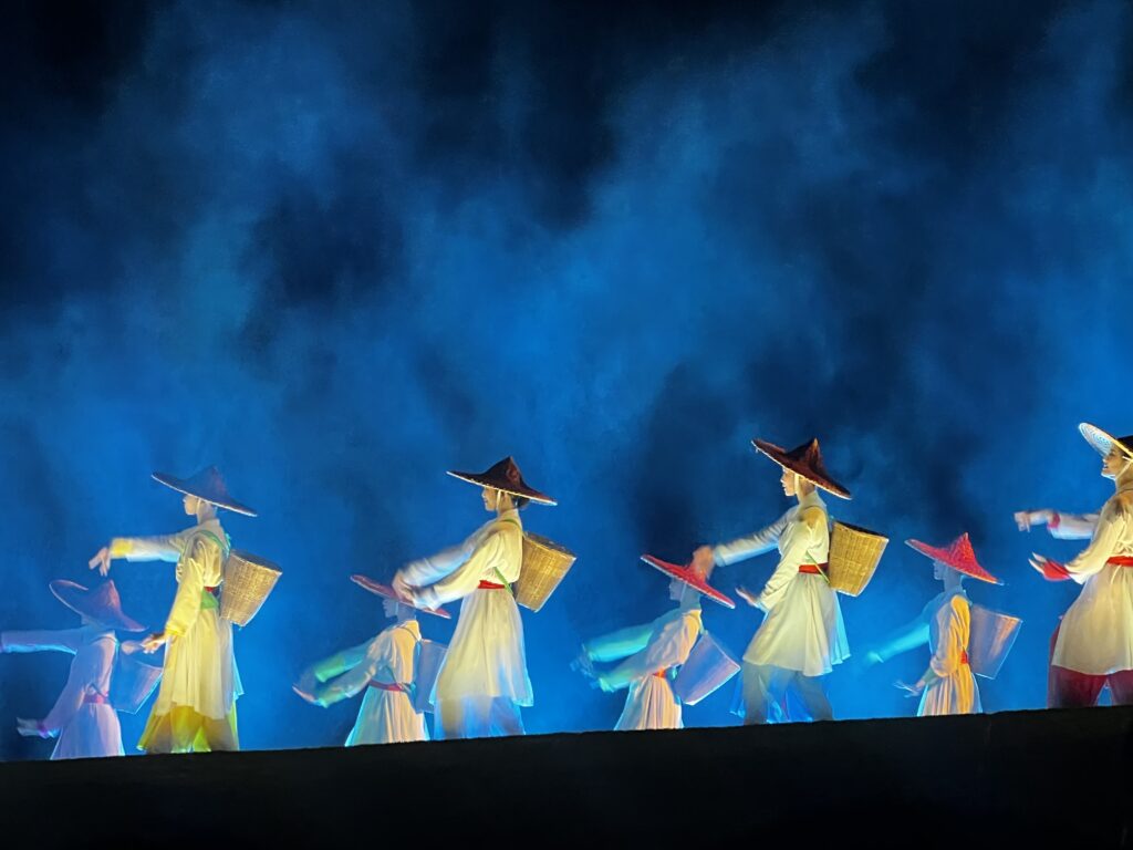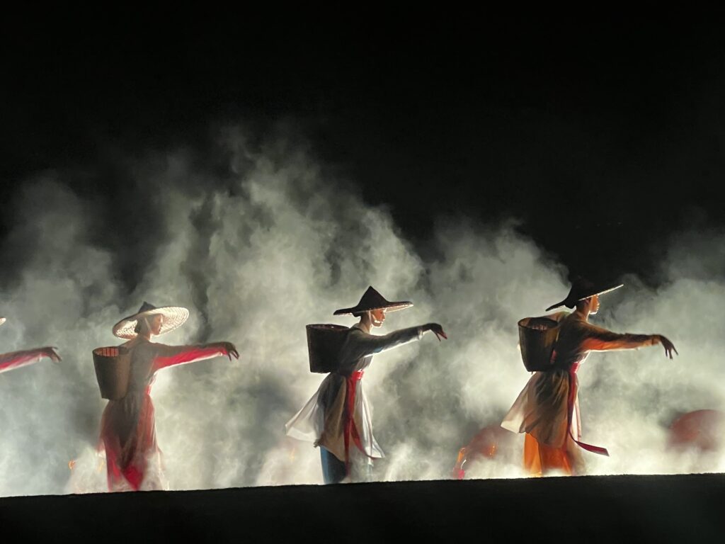 Vi har billetter til en storslagen utendørs forestilling som forteller hvordan te har vært handelsvare og blitt brukt som valuta. Dyrbare te-sorter kurerte keiseren og hans familie fra sykdom. Legenden gjorde at te ble internasjonal luksusvare. Vi har fått gjengitt innholdet på forhånd, for vi skjønner ikke stort av språket. Men det er ikke nødvendig. Dette showet minner mest om en OL-åpningsseremoni, der hundrevis av skuespillere og dansere høster inn te og forteller historien.