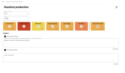 Eksempelet under viser at hasselnøtt-produksjon fra Tyrkia har høy risiko som slår ut på flere parametere. Størst risiko er det i kategoerien CBA / FOA som viser mangel på organisasjonsfrihet og muligheten til å organisere seg i fagforeninger. Det er også stor risiko for korrupsjon og tvangsarbeid. Særlig sårbare er syriske flyktninger og immigranter med dårlige betalte jobber i den uformelle sektoren. Likestilling og levelønn får også 3 av 5 score i risikokartleggingsverktøyet, og bør dermed undersøkes videre.