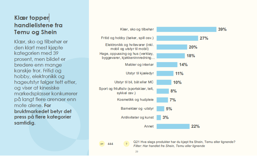 2 millioner nordmenn har handlet på Temu eller Shein, viser undersøkelsen fra Vend. Blant dem som har handlet på kinesiske markedsplasser, oppgir 39 prosent at de bevisst har valgt nytt fra Temu eller Shein fremfor et tilsvarende brukt produkt. 44 prosent oppgir lavere totalpris som hovedgrunn til å velge kinesiske markedsplasser fremfor brukt. Tallene viser at kinesiske markedsplasser stjeler kunder som ellers kunne havnet i bruktmarkedet.